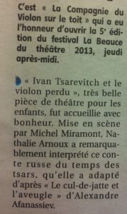 Tardivement en raison d’une absence à l’étranger par rapport au spectacle auquel j’ai pu assister le jeudi 26 avril …. on apprécie les décors originaux , les costumes sobres mais ravissant , le tout dans une grande simplicité qui nous enchante, et nous transporte dans l’essentiel : l’imaginaire ! la symbolique du conte que je vous laisse découvrir, nous parvient au travers d’un voyage coloré de touches musicales, touchant aussi bien les petits que les grands …. cœurs d’enfants …. compliments à l’artiste, seule sur scène, aux multiples talents …j’ai hâte d’y retourner en juillet, merci pour cette note de fraicheur !